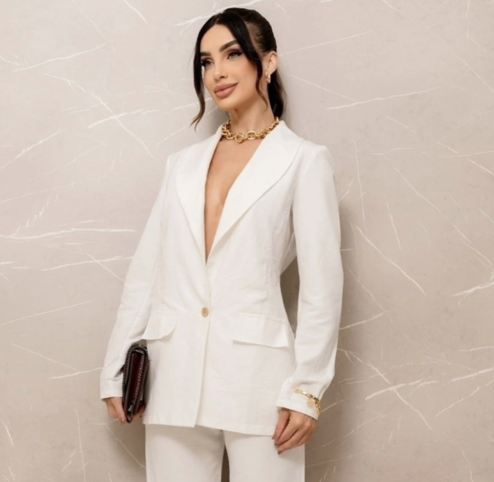 Blazer confeccionado em linho, estruturado com excelente acabamento, com 1 botão funcional, lapelas decorativas (não possui bolsos). Peça indispensável e perfeita para estações quentes, pois não possui forro e seu tecido é respirável.