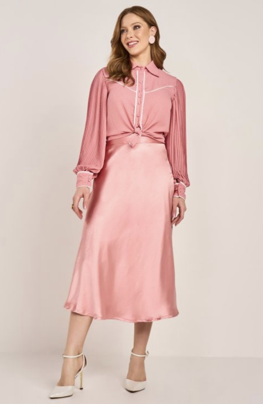 A saia gabriela possui modelagem justa que abre a partir do quadril, possui forro e abetura e fechamento por zíper na lateral. Possui brilho característico do tecido. A saia de cetim é uma tendência que faz muito sucesso, pois possibilita várias propostas de produção, desde o casual ao mais chique. Combina perfeitamente com camiseta e tênis, como também com salto. É uma peça versátil e confortável para ter sempre.