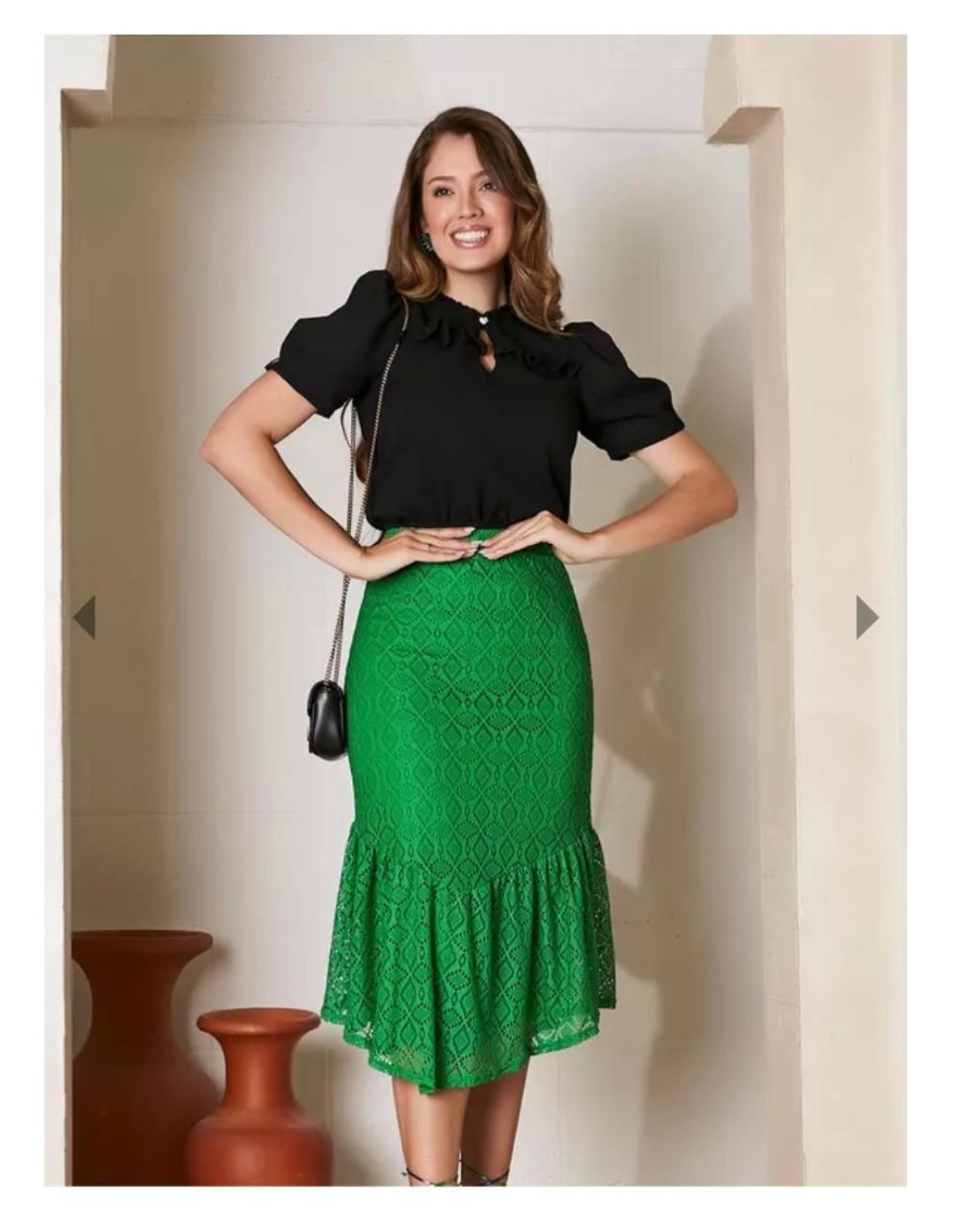 A Saia Leda possibilita várias combinações de cores e modelos de blusas. Monte com ela, produções clássicas, formais ou despojadas. É uma bela opção para quando você quer colocar cor na sua produção.