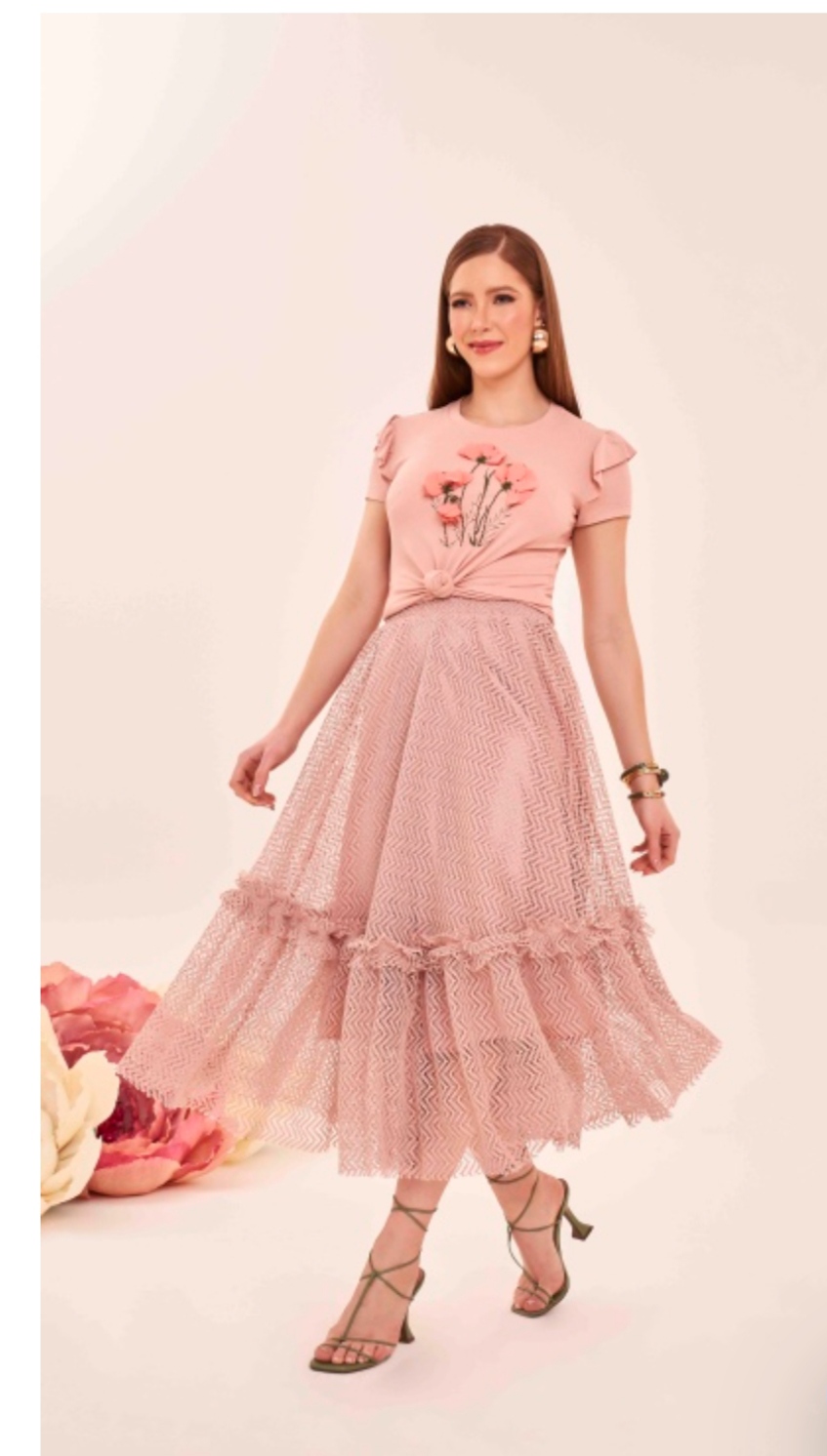 Modelagem: Saia em Tela de Crochê totalmente forrada, evasê com elástico na cintura e detalhes de babadinhos no barrado.