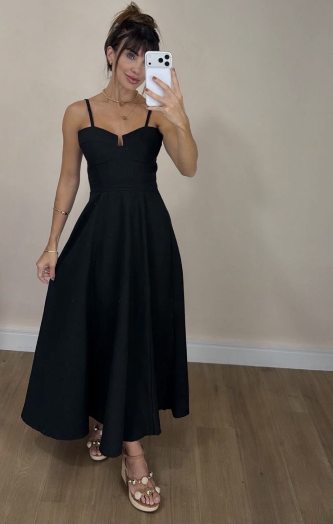 O vestido Lara possui a modelagem evasê que valoriza todos os biotipos, possui elastex nas costas e abertura e fechamento por zíper, é um vestido de alças finas e busto bem marcado, o que possibilita usá-lo como sobreposição com camisas ou blusas. É um modelo perfeito para qualquer ocasião.