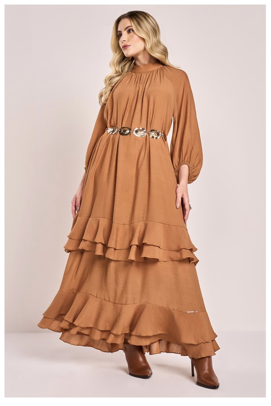 Vestido no estilo boho, com mangas longas, gola alta, detalhes de babados na saia e botão na parte de trás da gola para facilitar ao vestir. Possui forro em todo o comprimento do vestido.