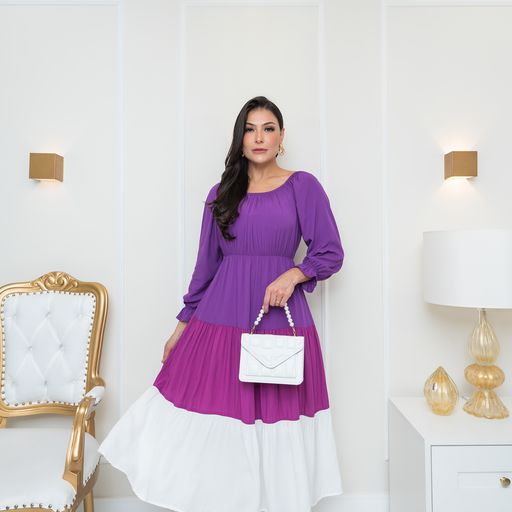 VESTIDO PRISCILA Tecido: Viscolinho Tamanho: M Medidas Aproximadas em centímetros: Busto 93 à 98 / Cintura 84 à 94 / Quadril 104 à 118 / Comprimento 114. Cor: Color Block (Roxo, Fucsia e Branco) Possui Forro na parte da Saia Modelagem: Vestido Fluido, Elástico no decote e na cintura. Saia em três Marias e mangas longas com lastex nos punhos. A tendência Color Block está prevista para continuar e sem data para sair! O vestido Priscila trouxe essa tendência combinando a cor do ano: Very Peri! Além disso, você pode usar o decote ombro a ombro ou mais fechado. Também pode ajustar a altura das mangas (mangas longas quando usadas em 7/8 são super elegantes). A saia em três Marias não narca nada e ainda disfarça os quadris largos e estreitos. Que vestido perfeito! Combine com jaqueta ou Blazer, salto, rasteira e até mesmo tênis! Compre o seu e tenha um vestido para muitas ocasiões.